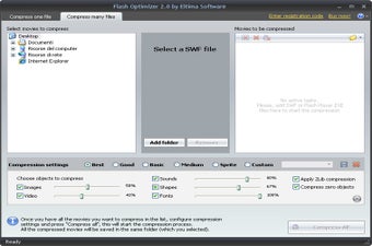 Flash Optimizer svolge il suo compito in maniera pressoché automatica ed è alla portata anche dei meno pratici. Dovrai solo scegliere il filmato in Flash e scegliere un profilo di compressione. Il programma ne offre cinque predefiniti e la possibilità di crearne uno con impostazioni personalizzate.
